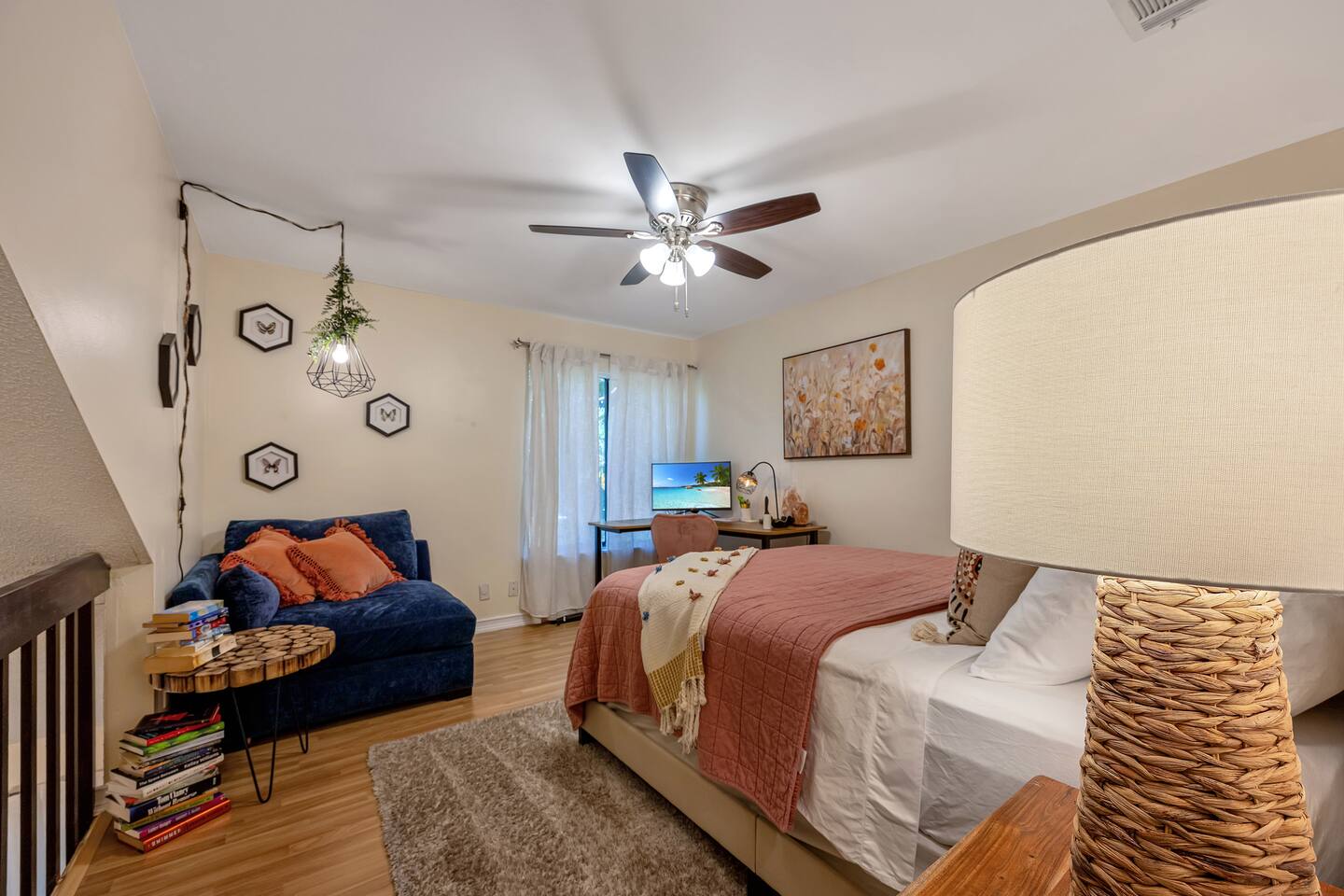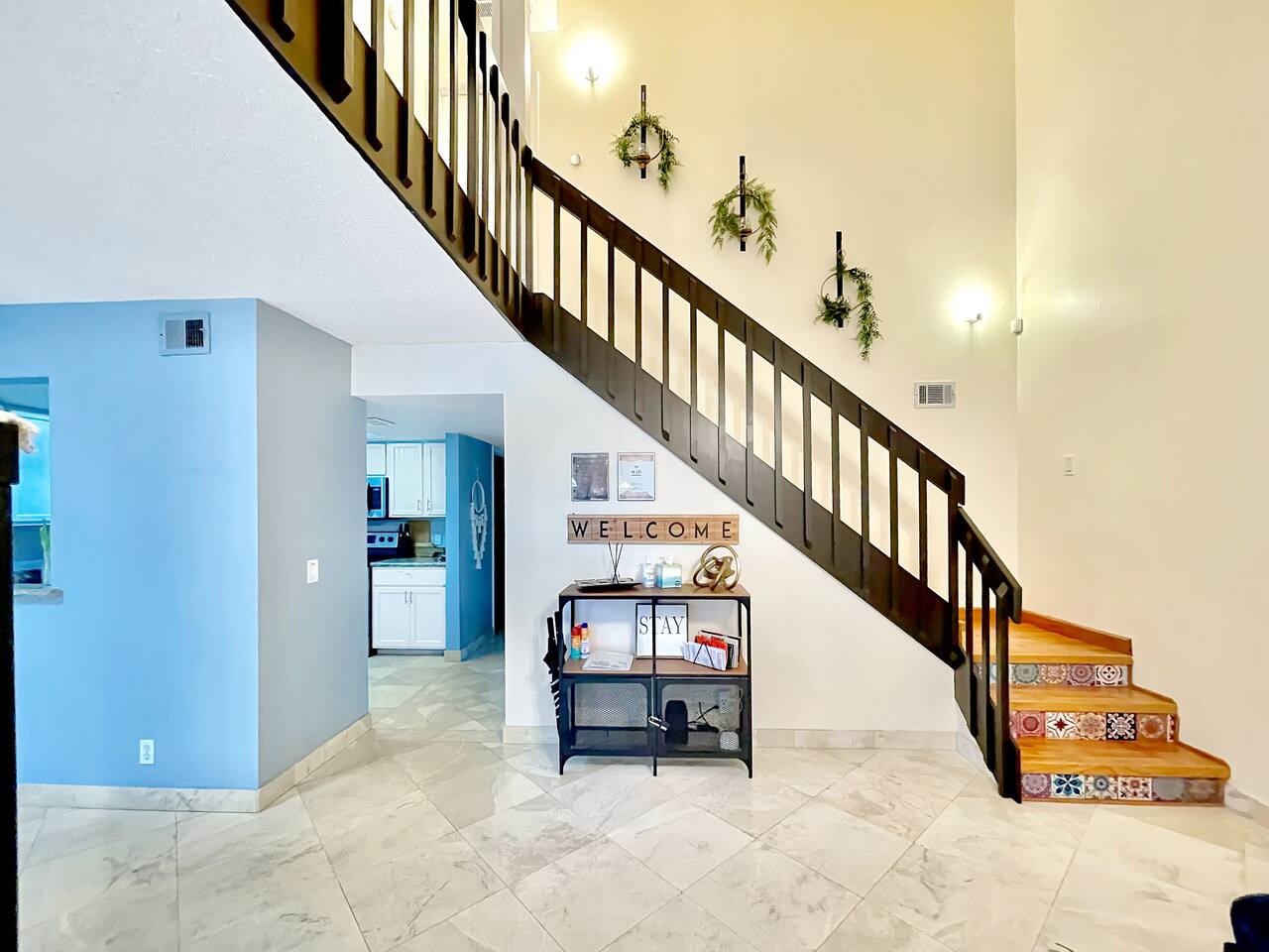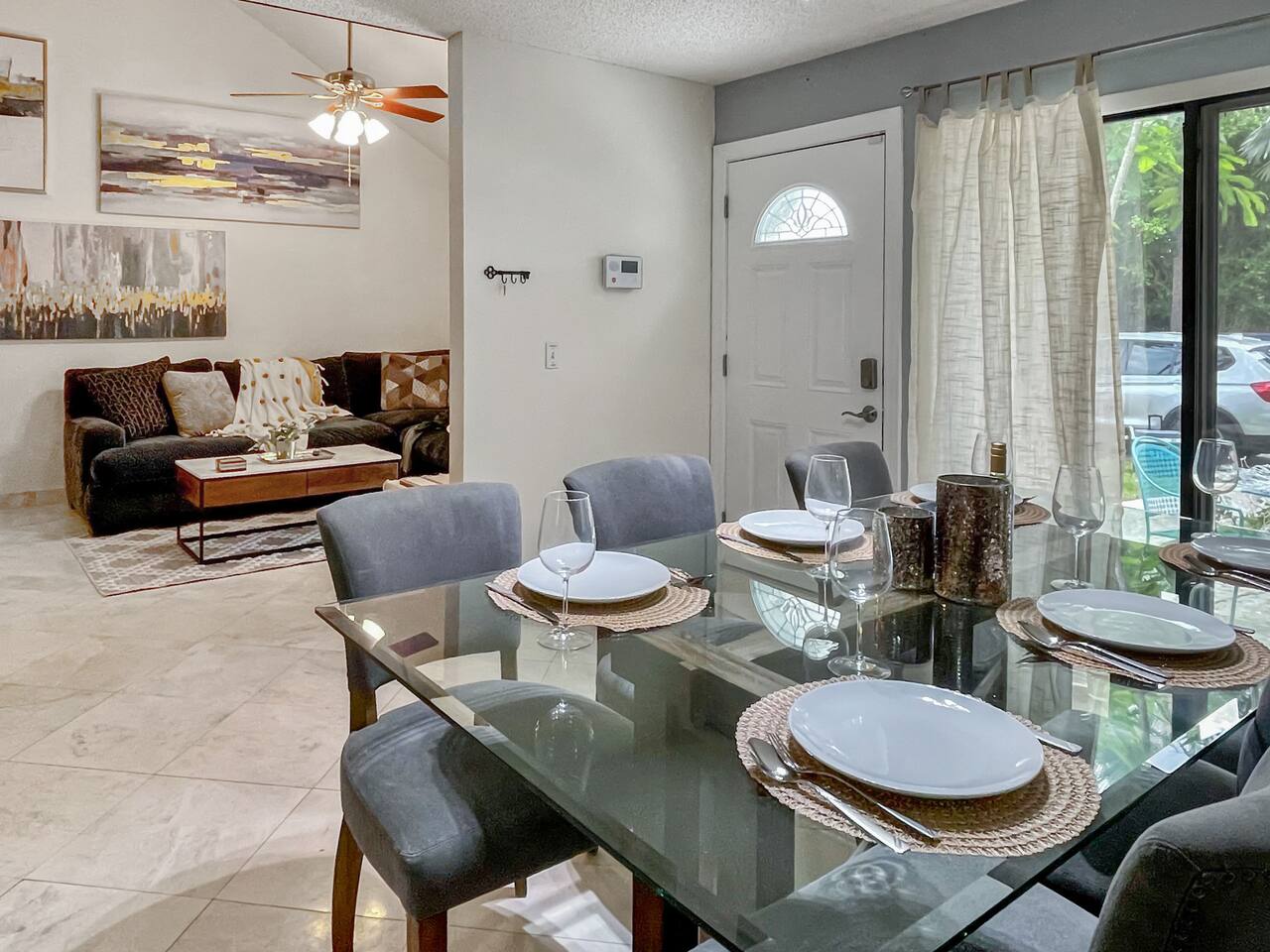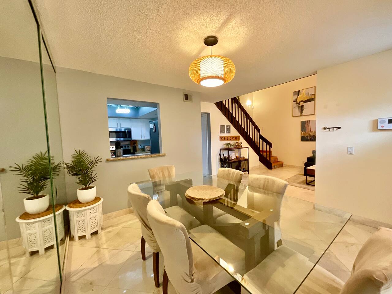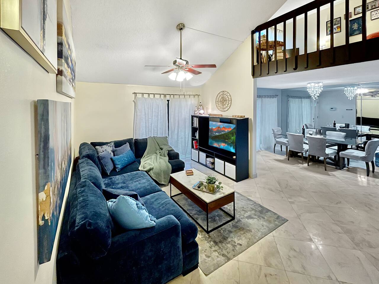 LOCATION: 5 mins to Rapids Water Park 10 mins to Downtown Palm Beach Gardens & The Gardens Mall 15-20 mins to Palm Beach International Airport (PBI) 8-10 mins to PGA National Resort & Golf Club 20 mins to Downtown West Palm Beach & Clematis Street 12 mins CACTI Park of The Palm Beaches (MLB spring training) HOME LAYOUT: 3 sleeping areas: 2 private bedrooms + 1 open loft bedroom 2 full bathrooms In-unit washer and dryer located in the downstairs bathroom Private fenced backyard with pergola, BBQ, fire pit, and patio seating Two dedicated parking spaces High-speed WiFi—ideal for work or streaming Centrally located with easy access to golf, sports, shopping, and dining BEDROOMS: Primary Bedroom (Upstairs) King-size bed with premium Nectar Copper mattress En-suite bathroom Smart TV Dresser and closet space Bedroom 2 – Open Loft (Upstairs) Queen-size bed Open-concept loft (no door) Perfect for flexible sleeping or home office use Bedroom 3 – Ground Floor Queen-size bed with top-of-the-line Ghost mattress Closet and drawer space KITCHEN & DINING: Fully equipped kitchen with refrigerator, stove, oven, microwave, and dishwasher Cookware, utensils, dishes, and glassware included Coffee maker and toaster Dining table comfortably seats 4 LIVING ROOM: Comfy sofa and lounge seating Smart TV with streaming options Open-concept layout connecting to kitchen and dining areas OUTDOOR SPACE: Private backyard with patio and sun pergola (not waterproof) BBQ grill and fire pit Outdoor seating area—perfect for enjoying Florida’s warm weather PARKING: Two dedicated parking spaces directly in front of the home Additional guest parking available upon request NEARBY ATTRACTIONS: Rapids Water Park (5 mins): A family-friendly water park with slides and a lazy river Downtown Palm Beach Gardens & The Gardens Mall (10 mins): Shopping, dining, and entertainment options Juno Beach (15 mins): Beautiful beaches and the Juno Beach Pier Palm Beach International Airport (PBI) (15-20 mins): Convenient access for travelers PGA National Resort & Golf Club (8-10 mins): World-class golfing facilities Downtown West Palm Beach & Clematis Street (20 mins): Vibrant nightlife and cultural attractions Clover Park (45 mins): Spring training home of the NY Mets CACTI Park of The Palm Beaches (12 mins): Catch all the action of Spring Training at CACTI Park of the Palm Beaches, the home of the Houston Astros and Washington Nationals!